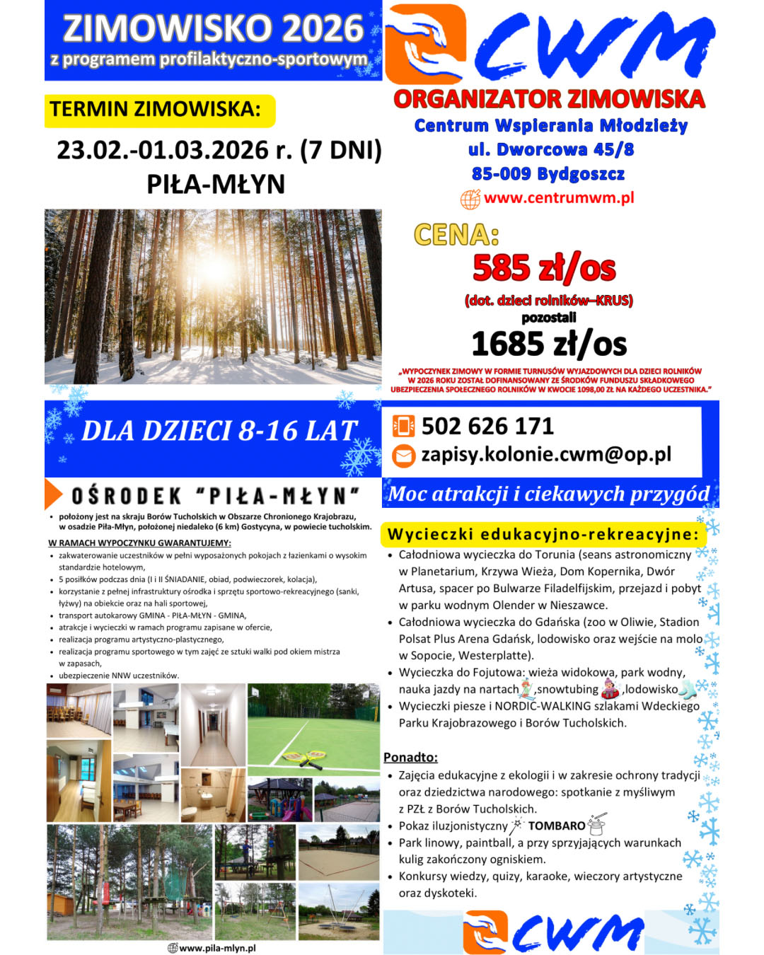 ZAPISY na zimowiska przyjmowane są pod adresem zapisy.kolonie.cwm@op.pl lub telefonicznie